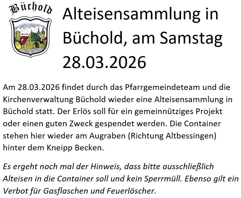 Der Pfarrgemeinderat sammelt wieder Alteisen. Bitte das Eisen zu den Container in der nähe Kneipp-Anlage bringen. "Zugunsten eines guten Zwecks in Büchold"