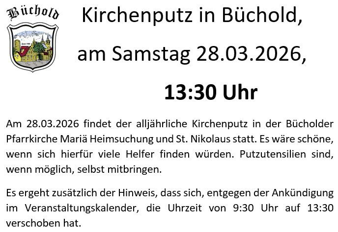 Pfarrkirche BücholdDer Pfarrgemeinderat und die Kirchenverwaltung ruft zur jährlichen Kirchereinigung auf. Viele Hände – schnelles Ende!