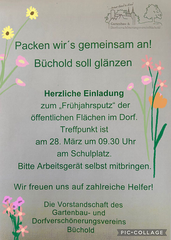 Treffpunkt SchulplatzDer Gartenbau- und Dorfverschönerungsverein möchte unser Dorf glänzen lassen. 9.30 Uhr Treffpunkt Schulplatz. Bitte Besen und Schaufel mitbringen.