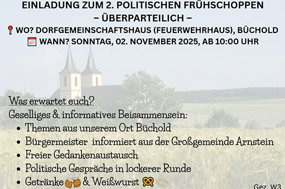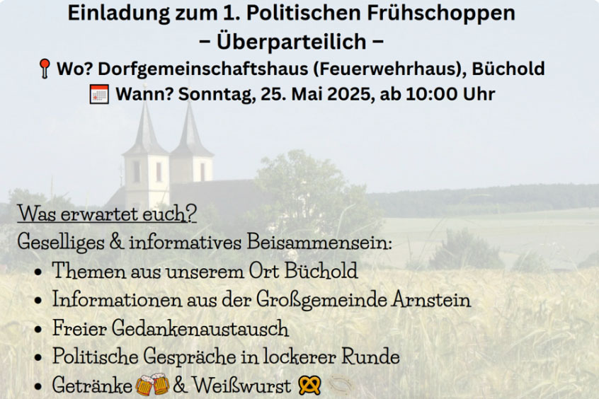 Sportheim BücholdDie Ortsgruppe des Bund Naturschutz und der Gartenbau- und Dorfverschönerungsverein laden am 11. Mai zur Vogelstimmenwanderung ein. Start ist um 7 Uhr am Sportheim. Für Teilnahme am anschließenden Frühstück bitte bei @Peter Fuchs 0170/4182991 oder Notker Wolf 0162 2828164 anmelden. 🦅🐦⬛🦉 Das reichhaltige Frühstücksbuffet nach der Wanderung wird von der DJK Büchold organisiert und findet […]